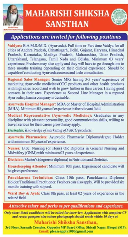 Vaidyas: B.A.M.S./M.D. (Ayurveda) required with a minimum of 3 years of experience.