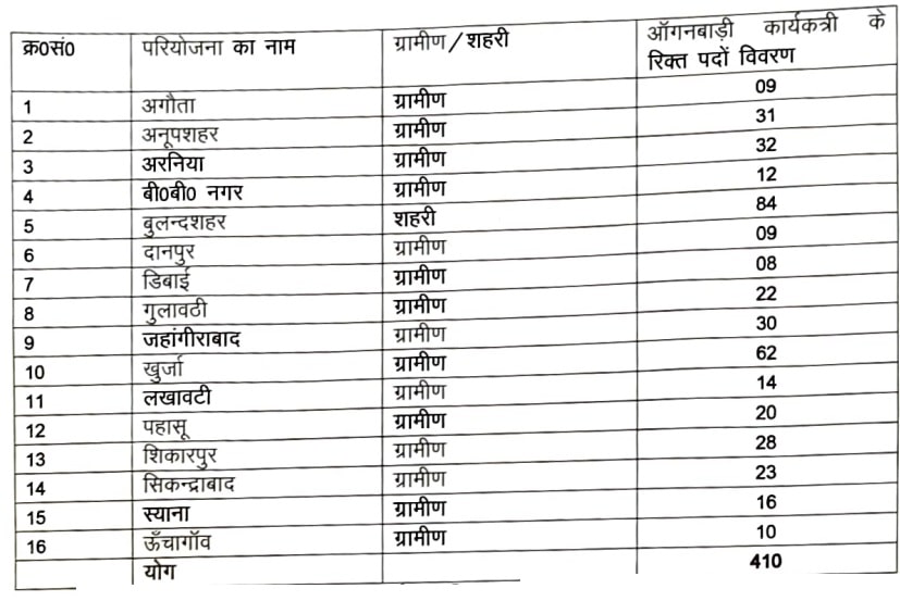 जिलेवार पदों की जानकारी के अनुसार बुलंदशहर आंगनवाड़ी भर्ती – कुल 410 पद