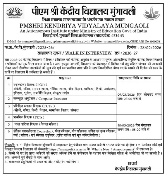 Dear friends, PM Shri Kendriya Vidyalaya Mungawali (M.P.) has released KVS Ashok Nagar Recruitment 2026. All the candidates who like government job can see the PDF of KVS Ashok Nagar Notification 2026. Eligible and interested candidates can apply for this job before the last date. Candidates read this article till the end to get the dates, qualifications, age limit, fees, application and other information of Kendriya Vidyalaya Ashok Nagar Recruitment Form 2026.