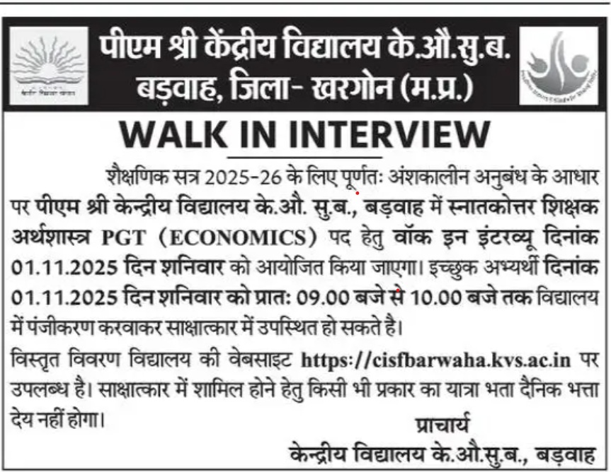 Date As Per Kendriya Vidyalaya Khargone Recruitment 2025