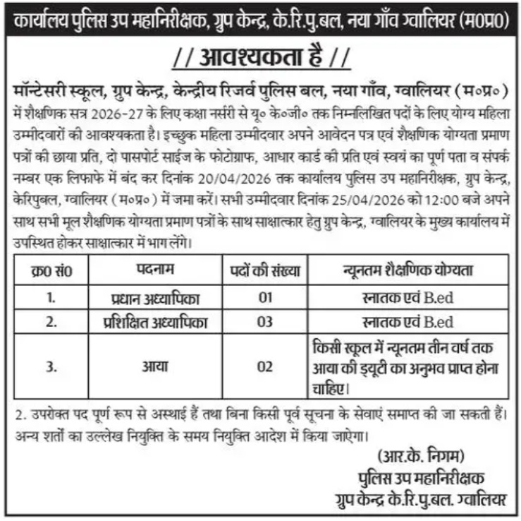 Dear friends, Montessori School, Group Centre, CRPF, Naya Gaon, Gwalior (M.P.) has released MP CRPF School Recruitment 2026. All the candidates who like government job can see the PDF of MP CRPF School Notification 2026. Eligible and interested candidates can apply for this job before the last date. Candidates read this article till the end to get the dates, qualifications, age limit, fees, application and other information of MP CRPF School Recruitment Form 2026.