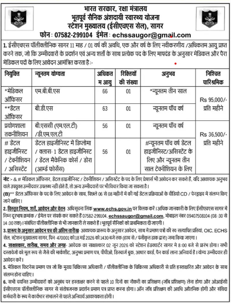 Dear friends, Ex-Servicemen Contributory Health Scheme (ECHS), Sagar has released MP ECHS Recruitment 2026. All the candidates who like government job can see the PDF of MP ECHS Notification 2026. Eligible and interested candidates can apply for this job before the last date. Candidates read this article till the end to get the dates, qualifications, age limit, fees, application and other information of MP ECHS Recruitment Form 2026.