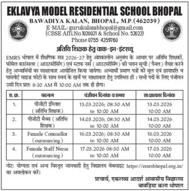 Dear friends, Eklavya Adarsh Awasiya Vidyalaya, Bhopal has released MP EMRS Recruitment 2026. All the candidates who like government job can see the PDF of MP EMRS Notification 2026. Eligible and interested candidates can apply for this job before the last date. Candidates read this article till the end to get the dates, qualifications, age limit, fees, application and other information of MP EMRS Recruitment Form 2026.