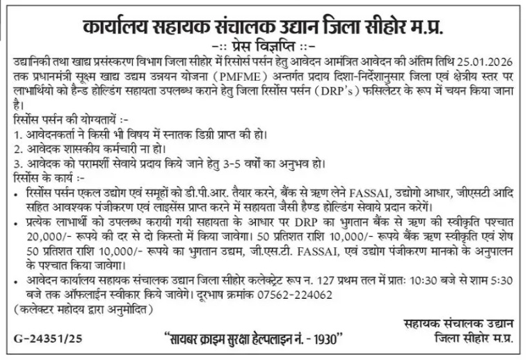 Applications will be accepted offline at the Office of the Assistant Director Horticulture District Sehore, Collectorate Room No. 127, First Floor, from 10:30 am to 5:30 pm.