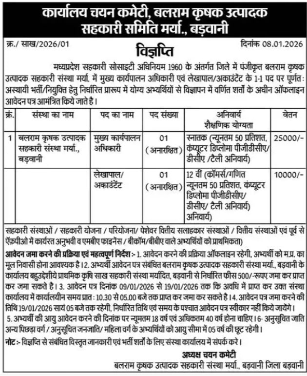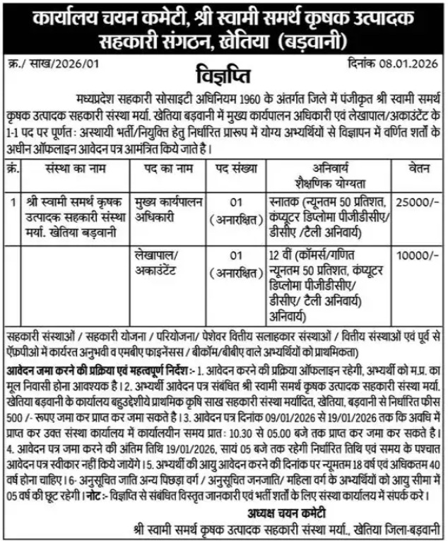 प्रिय मित्रों कार्यालय चयन कमेटी उत्पादक सहकारी संस्था मर्यादित जिला बडवानी (म.प्र.) द्वारा MP Karyalaya Chayan Recruitment 2026 वेबसाइट पर जारी किया गया है। सरकारी नौकरी को पसंद करने वाले सभी उम्मीदवार MP Karyalaya Chayan Recruitment Notification 2026 की पीडीऍफ़ देख सकते है। इस जॉब के लिए योग्य और इच्छुक उम्मीदवार अंतिम तिथि से पहले आवेदन कर सकते हैं। उम्मीदवार MP Karyalaya Chayan Recruitment Form 2026 की तिथियाँ, योग्यता, आयु सीमा, फीस, आवेदन और अन्य जानकारी प्राप्त करने के लिए इस आर्टिकल को अंत तक पढ़ें।