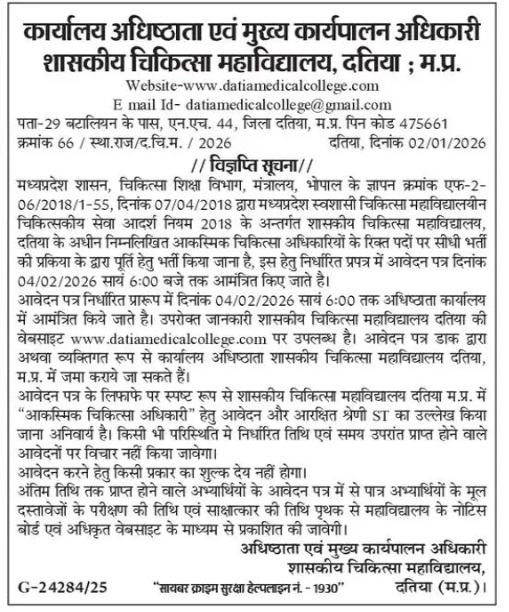 Application forms can be submitted by post or in person at the office. It is mandatory to clearly mention “Application for Casual Medical Officer” at Government Medical College, Datia, M.P. and the reserved category ST on the envelope of the application form.