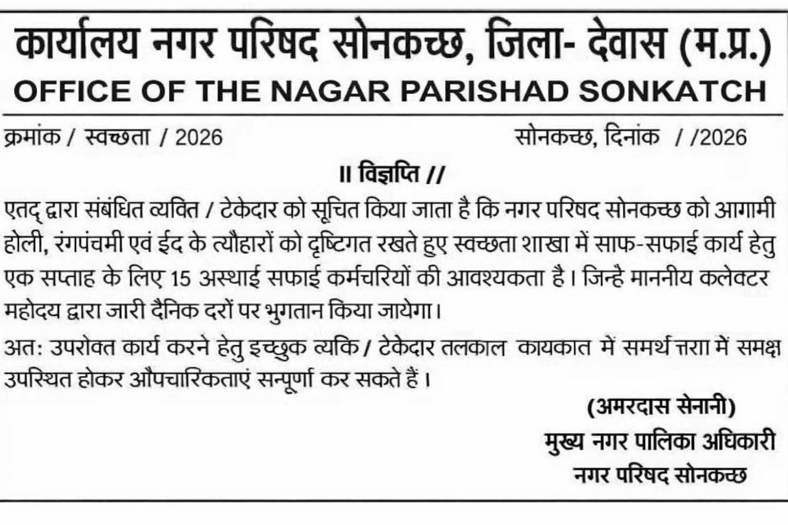 Dear friends, Office of Nagar Parishad Sonkachchh, District Dewas has released MP Nagar Parishad Recruitment 2026. All the candidates who like government job can see the PDF of MP Nagar Parishad Notification 2026. Eligible and interested candidates can apply for this job before the last date. Candidates read this article till the end to get the dates, qualifications, age limit, fees, application and other information of MP Nagar Parishad Recruitment Form 2026.