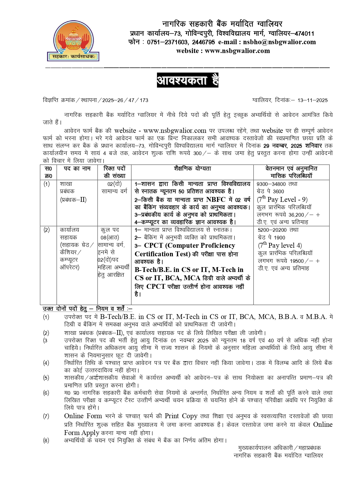 Dear friends, Nagarik Sahakari Bank Maryadit Gwalior has released MP Sahakari Bank Recruitment 2025. All the candidates who like government job can see the PDF of MP Sahakari Bank Notification 2025. Eligible and interested candidates can apply for this job before the last date. Candidates read this article till the end to get the dates, qualifications, age limit, fees, application and other information of MP Sahakari Bank Recruitment Online Form 2025.