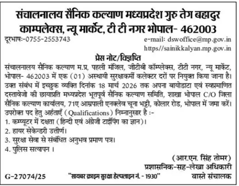 MP Sainik Kalyan Vibhag Recruitment 2026 – Vacancy For 12th Pass