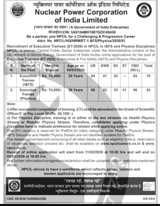 Dear friends, Nuclear Power Corporation of India (NPCIL) has released NPCIL Recruitment 2026. All the candidates who like government job can see the PDF of NPCIL Notification 2026. Eligible and interested candidates can apply for this job before the last date. Candidates read this article till the end to get the dates, qualifications, age limit, fees, application and other information of NPCIL Recruitment Online Form 2026.