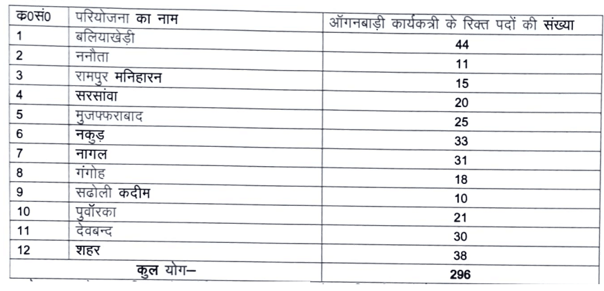 जिलेवार पदों की जानकारी के अनुसार सहारनपुर आंगनवाड़ी भर्ती – कुल 296 पद