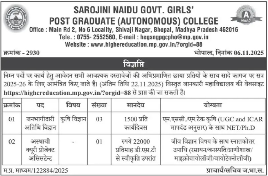 Dear friends, Sarojini Naidu Govt. Girls’ Post Graduate (Autonomous) College Bhopal, Madhya Pradesh has released SNGGPG Recruitment 2025. All the candidates who like government job can see the PDF of SNGGPG Notification 2025. Eligible and interested candidates can apply for this job before the last date. Candidates read this article till the end to get the dates, qualifications, age limit, fees, application and other information of SNGGPG Recruitment Form 2025.